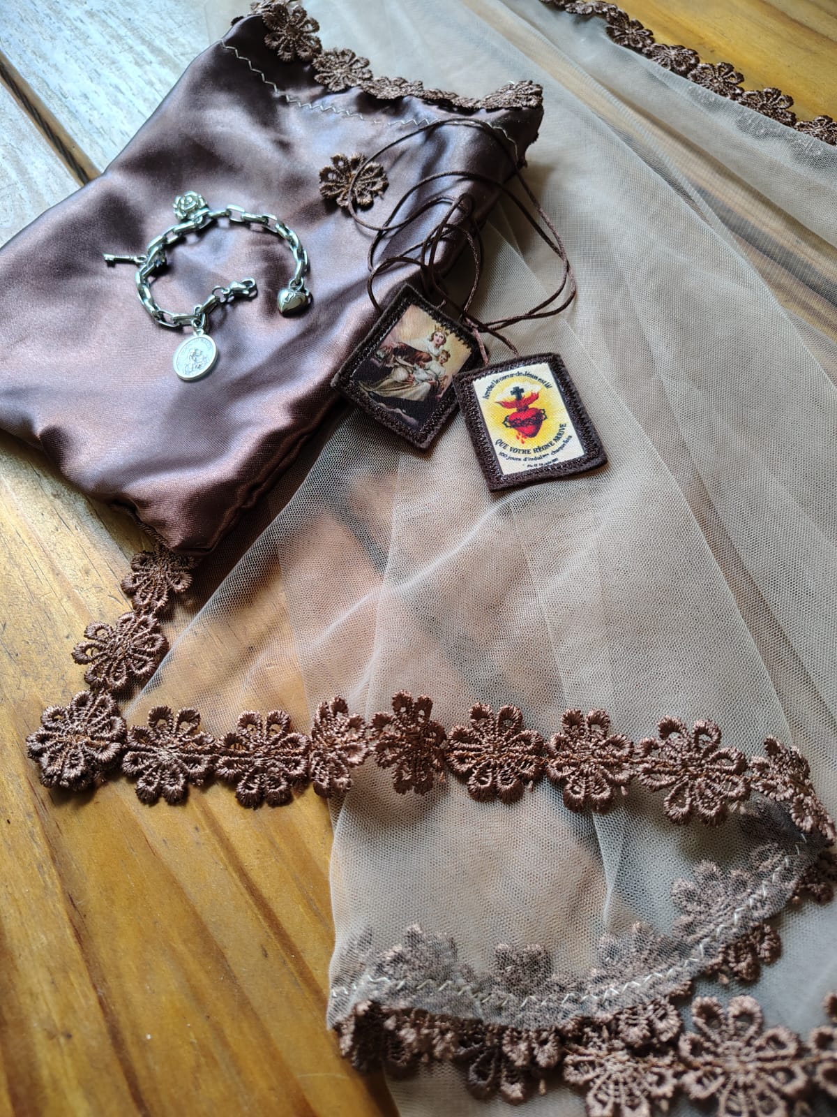 - 1 Escapulário do Carmo marrom em lã tradicional como manda a Santa Igreja no tamanho M.